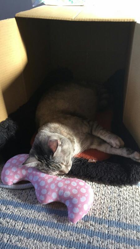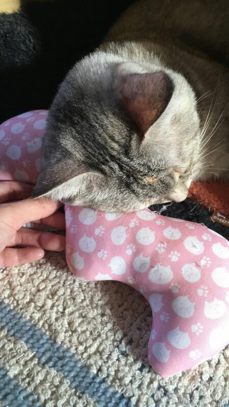 妹に枕をなおしてもらって熟睡のユズさん。餌のやり方とかはメモ残してやーとお願いしました。