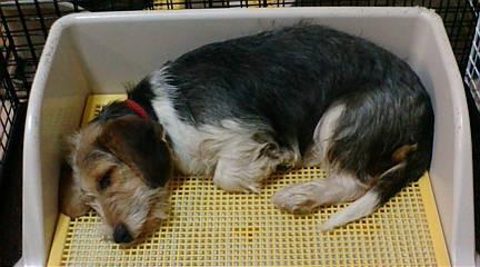 一夜明けて今朝、食事の後に猫砂を掃除していてふと、ももを見るとトイレで静かに寝ていました。