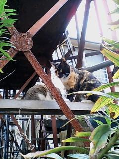 手前にいる三毛サビの猫が『アシュラ』で、顔が見えないキジ白の猫が『ふてちゃん』です。この2匹は仲良しでいつも一緒にいるんですよ。