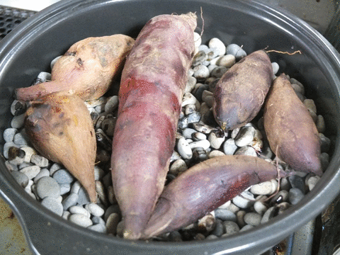 畑で収穫したサツマイモ、ホーロー鍋で焼いてみました。