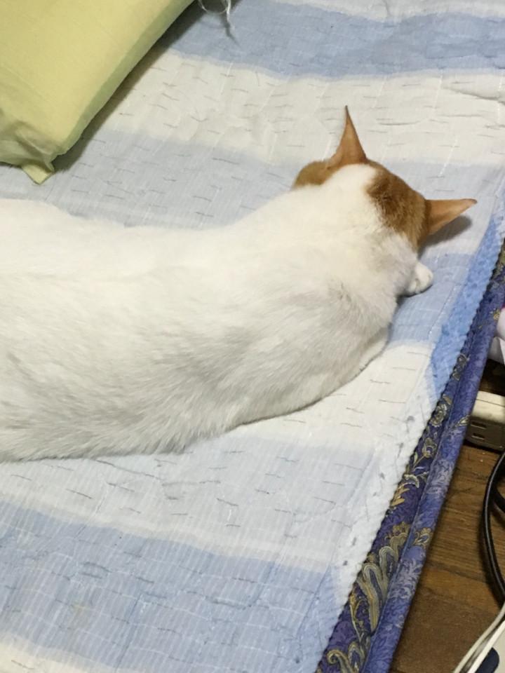 起きて、キッチンに行くと、3匹はおやつをおねだりして、食べた後、タマとラムは布団の上に乗ってました。