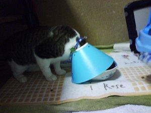 ゴロの時は金属で縫っており、カラーなどはしなかったのですが、すぅの場合、執刀周りをしっかりとヨード(なのか?)で消毒。縫ってるのも金属ではなかったみたいで、カラーでしっかり固定。歩くのもよたよた、といえうー感じ……。しかしエサはばくばくと食べてたので今のところ心配はないようです。薬も飲ませてきたし、一週間後の抜糸が待ち遠しいです。