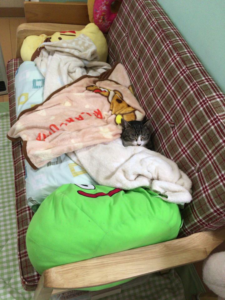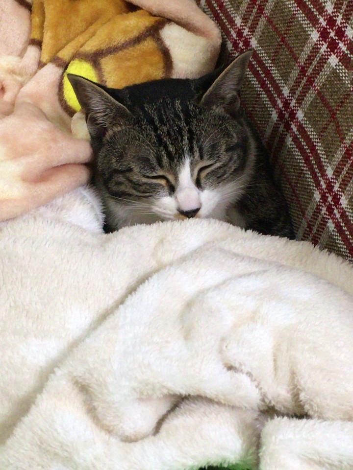直前まで一緒に寝てて、どくのかわいそうだからと膝掛けいっぱいかけたようです。そのまままた、寝たんだね(;゚∀゚︎)