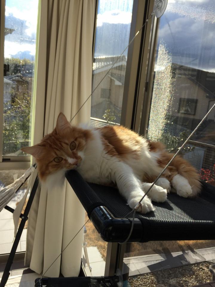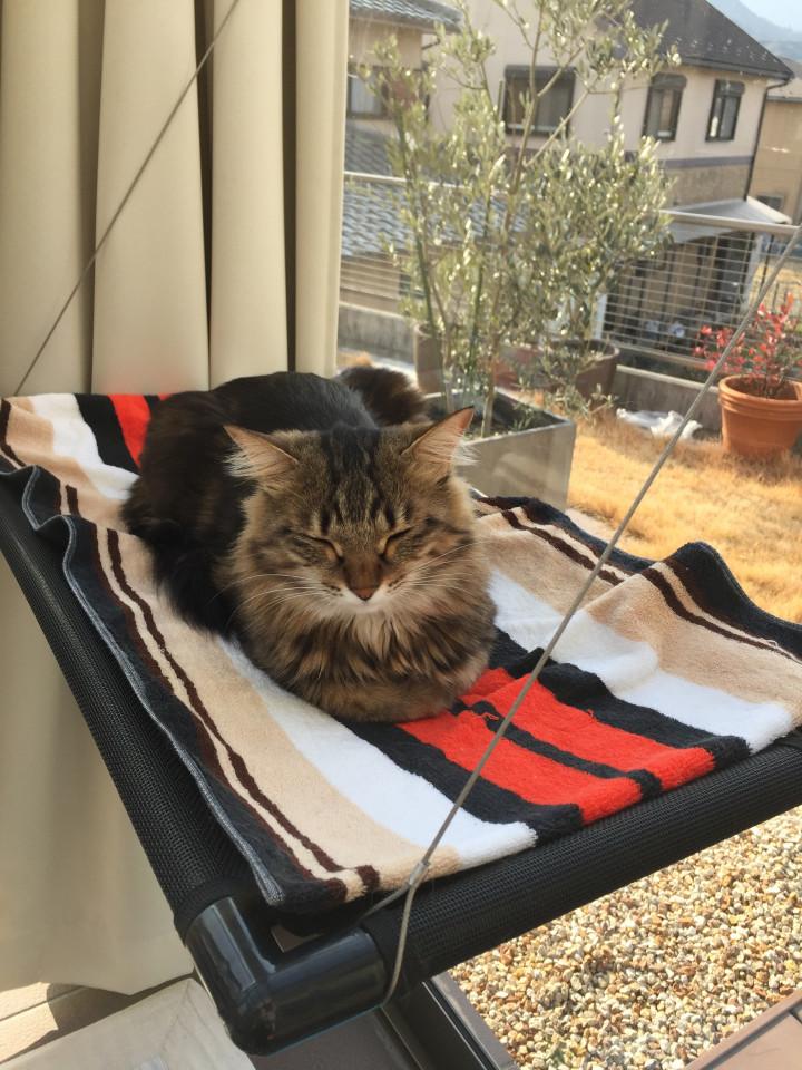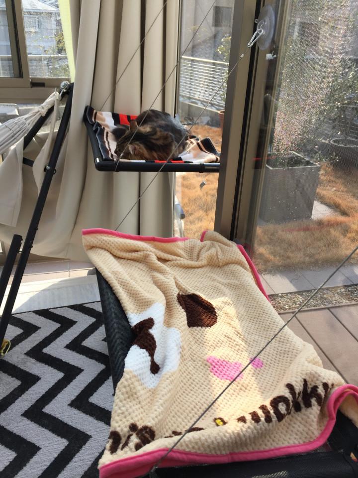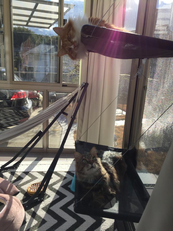 上下に設置してましたが、登りにくそうなので並列にし直しました。年代物のタオルがお似合いですよ、ムートさん。