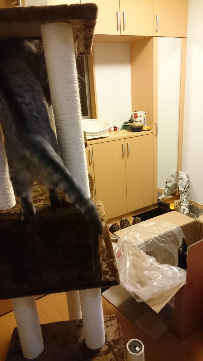 キャットタワー制作中も1段作るごとに結託した2匹に乗られて大変~