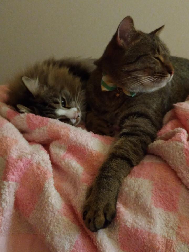 体が大きくなって、もう膝の上に2ニャンで乗るのは難しいですが、相変わらず仲の良い様子をみせてくれます❤