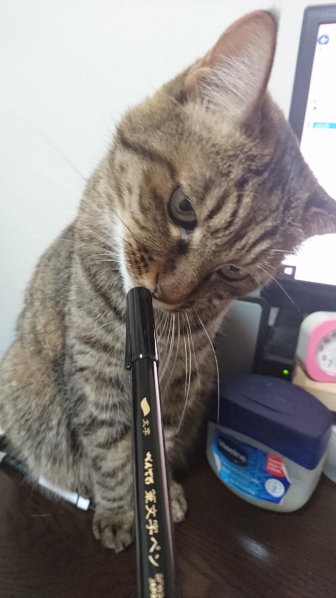 筆ペンを検査しつつかぁちゃんを監視するちび子さん。