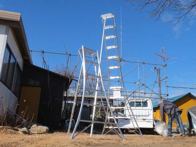 後は三脚脚立を活用して、ボサボサのツルを新アーチに誘引、斜めってるアーチも同じように固定したら、そちらにも残りの枝を誘引すれば春には素晴らしい白薔薇のアーチが二つ、出現することでしょう~♪