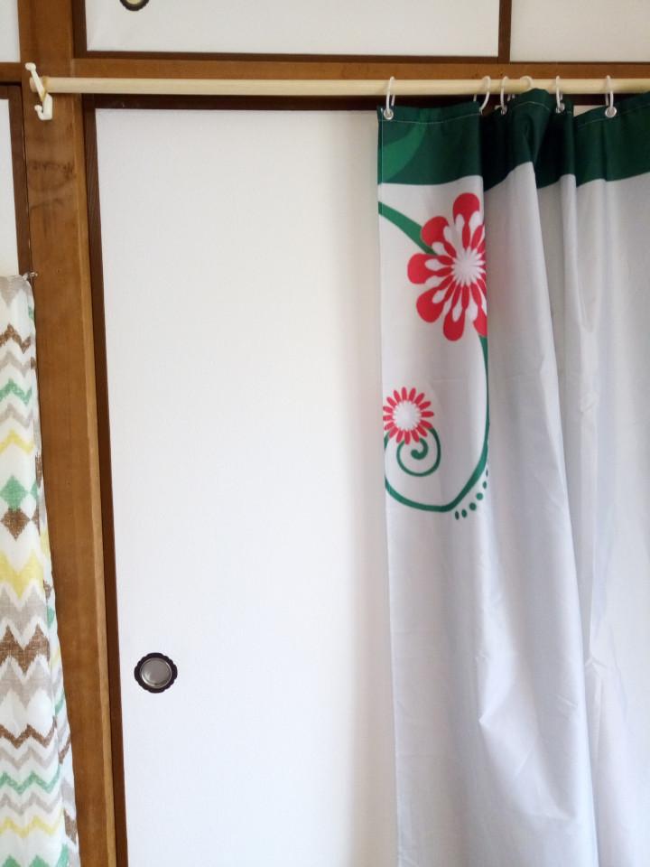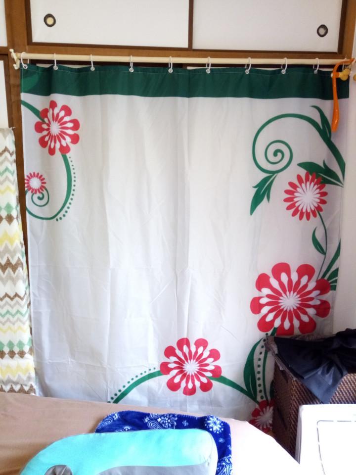 シャワーカーテン(両面ビニール加工されている厚めの布地)をポールにリングで通してます。