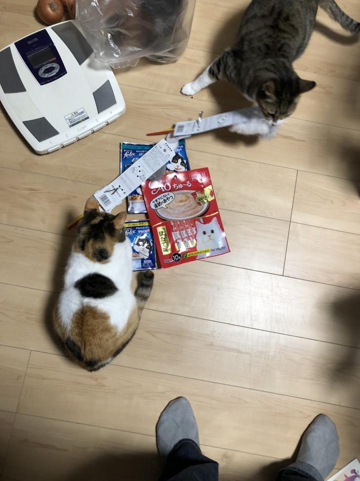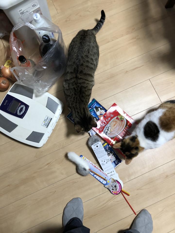 うちの3匹もおもちゃ好きな猫なので、運動不足解消させようと、猫じゃらしを買って来ました。ところが、まだ、包装を外さないうちに、タマムタがやって来て、しばらく見ていたのですが、待ちきれないムタが咥えて何処かに運んでしまいました。白とキジ色のセットが2組でしたが、1組包装が外された白とキジが転んでました。