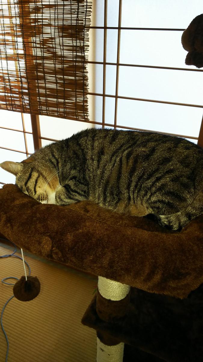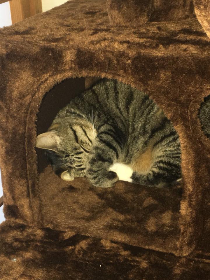 3,4日はキャットタワーの巣箱から出るのはご飯,トイレの時のみでしたが、遊びに誘うと出てくる様になりました。ε-(´∀`*)ホッ