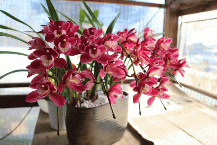 ワインカラーの花が垂れさがるように咲くシンビジューム「ファイヤービレッジ ワインシャワー」