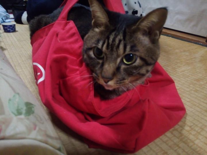 メロの真似してカバンに入ろうとして身がはみだしてしまう図