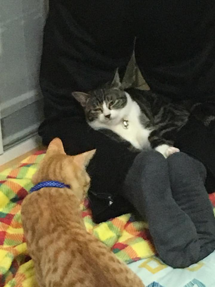 そして代わる代わるやってくるねこに膝を貸す修業。乗ってないねこも撫でる修業。