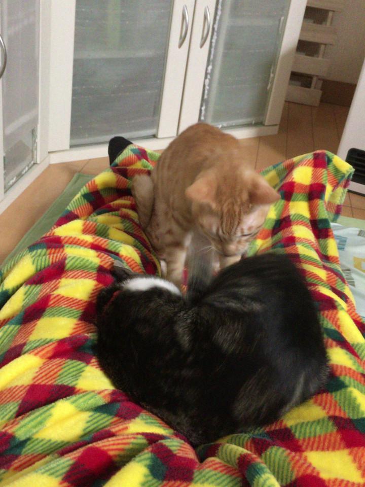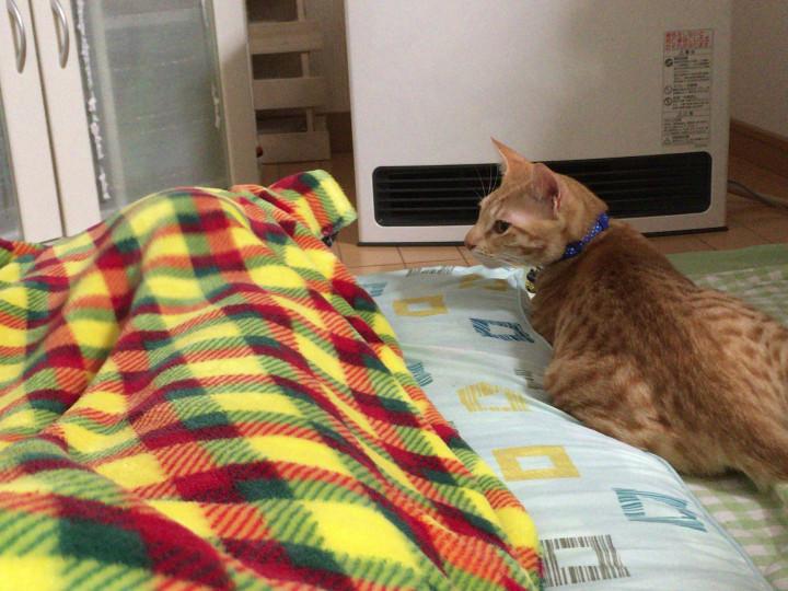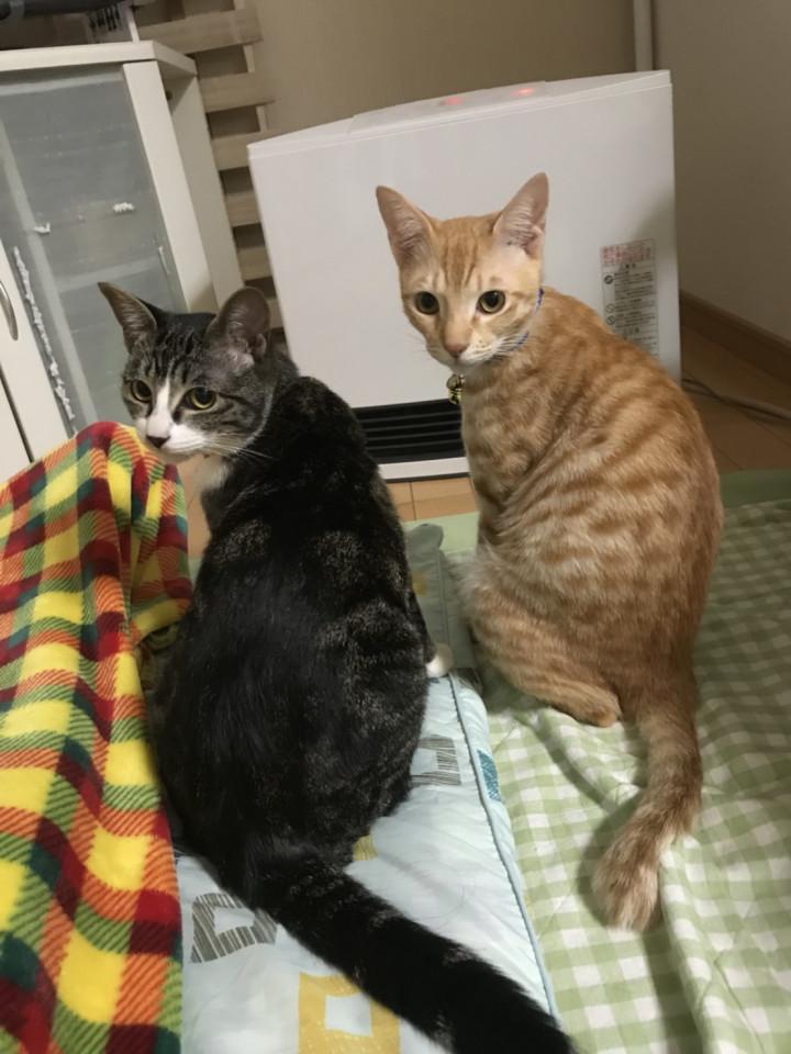 寒くて潜る関西ねこルイさんと、ヒーターは直風!の沖縄ねこバロン氏。
