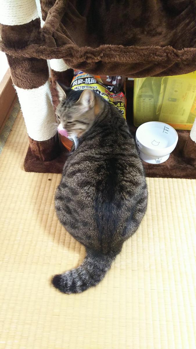 キャットタワーから自分で降りてきて、リビングをウロウロするようになり、徐々に慣れてきている様子。