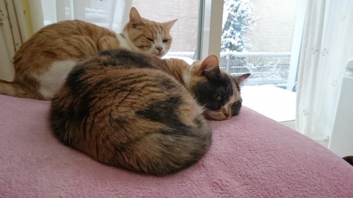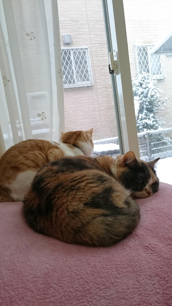 カーテンを開けて降り積もる雪を、ひたすら見学してます。めるは、ネムネムネムzzzz。。