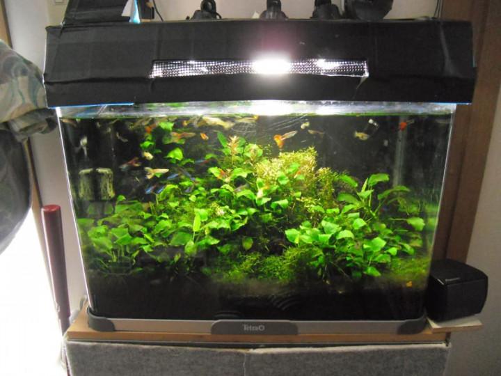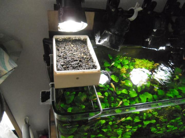 水槽の上は程よい湿気と温度(水温は23度くらい)です。それにLEDライトで照らしていますので、猫草の発育には良いかと思います。