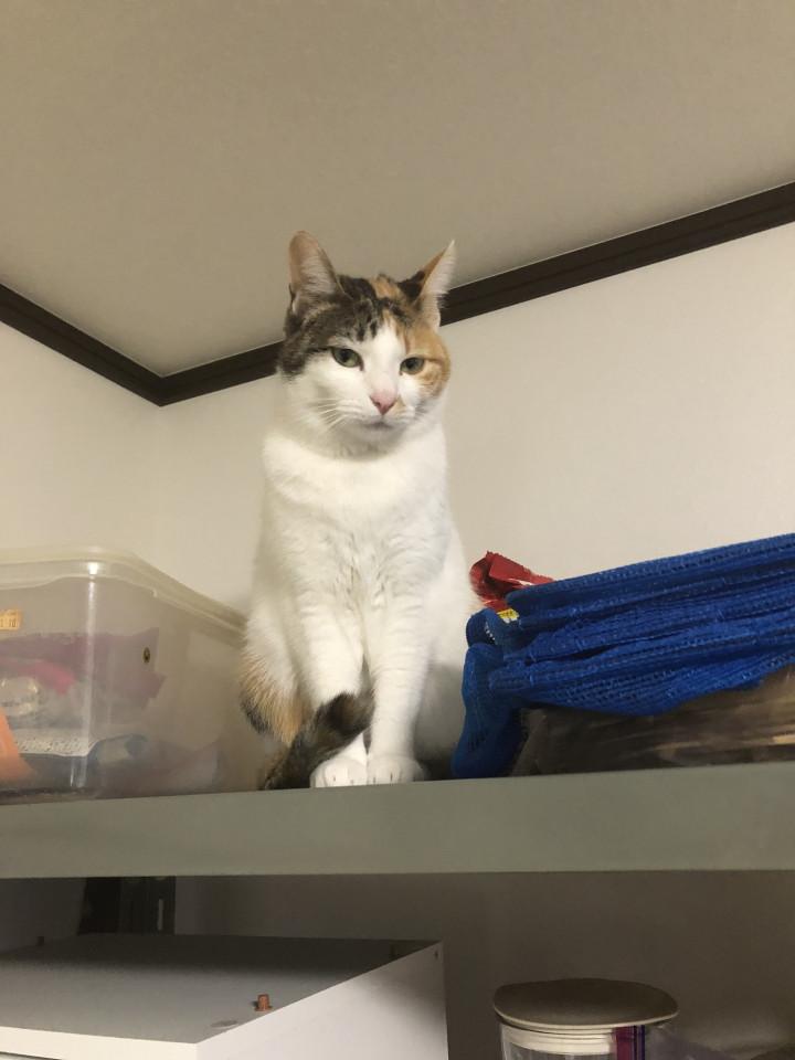 キッチンに猫達が来てオヤツをねだるのですが、食べ終わったタマ(三毛猫メス2歳)はキッチンが寒いので、僕の肩に乗って天井に近い棚の上でエアコンの風を受けてます。