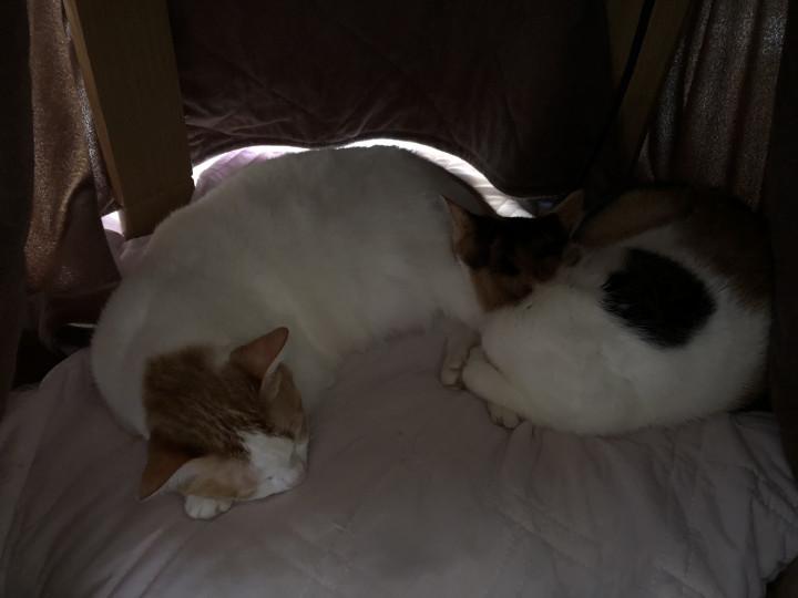 寒いので、猫達はトイレ、餌以外は部屋に行かなくなりました。