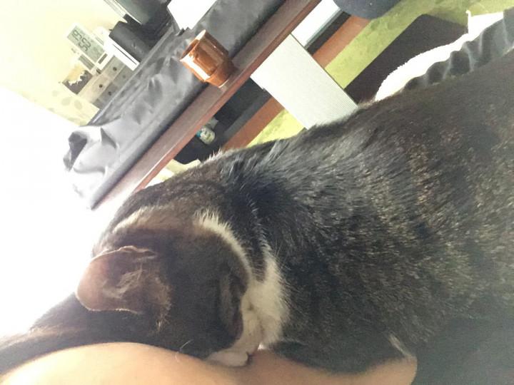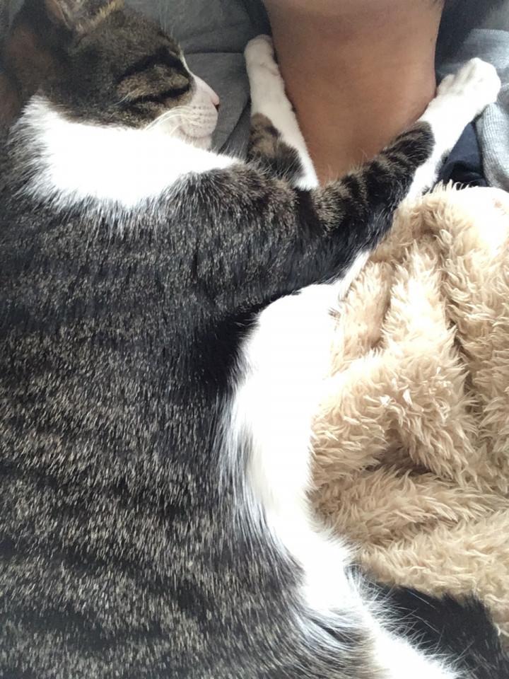 相変わらず甘えん坊のニャー氏は、ぐうたら母ちゃんがソファで横になってると必ずこうなる。