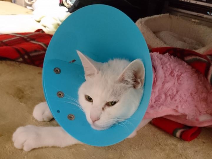 朝になってエリカラはずすと、ひたすらおしりの傷をなめてた。