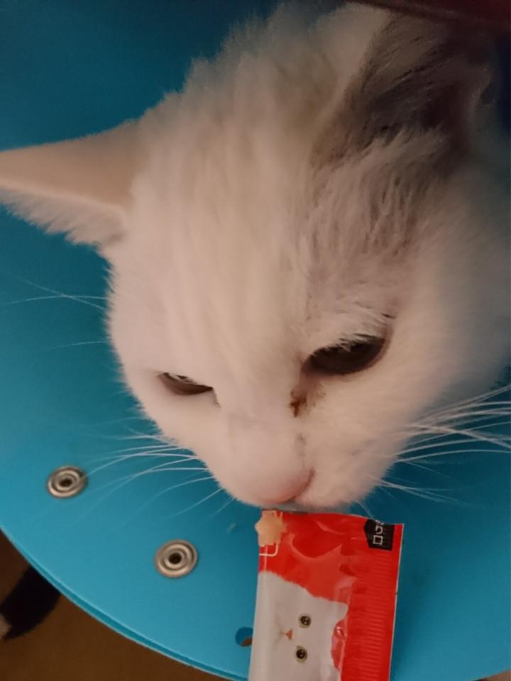 私が帰宅すると、膝に乗りたそうに来てくれた。しばらくボンヤリしてたから不安だったのかな?それとも、もう痛くないって言いにきたのかな?ちゅーるをあげると上手に食べた。