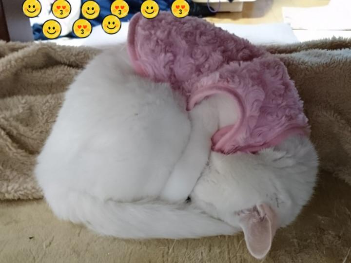 顔を埋めないようにマカロンクッション(上側)に寝させ、毛布かけて、時々ちゃんとお腹が上下してるのを確認。目を開けたままなので、時折、寝てていいんだよと、指で目を閉じさせたり。1時間ほどして、体勢を逆にしてあげたり。