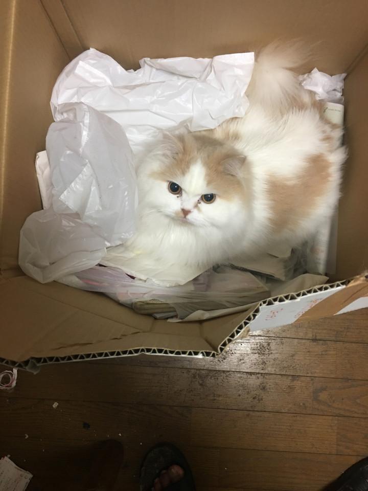 箱入り猫ですが何か御用かな?の目線。自身が片すのが面倒な事もあり転居した際の荷物を入れた段ボール箱で遊ぶスコです。退屈しのぎに功を奏しているみたいなので好きにさせておりますが見事な運動量で出入りはジャンプしてます。