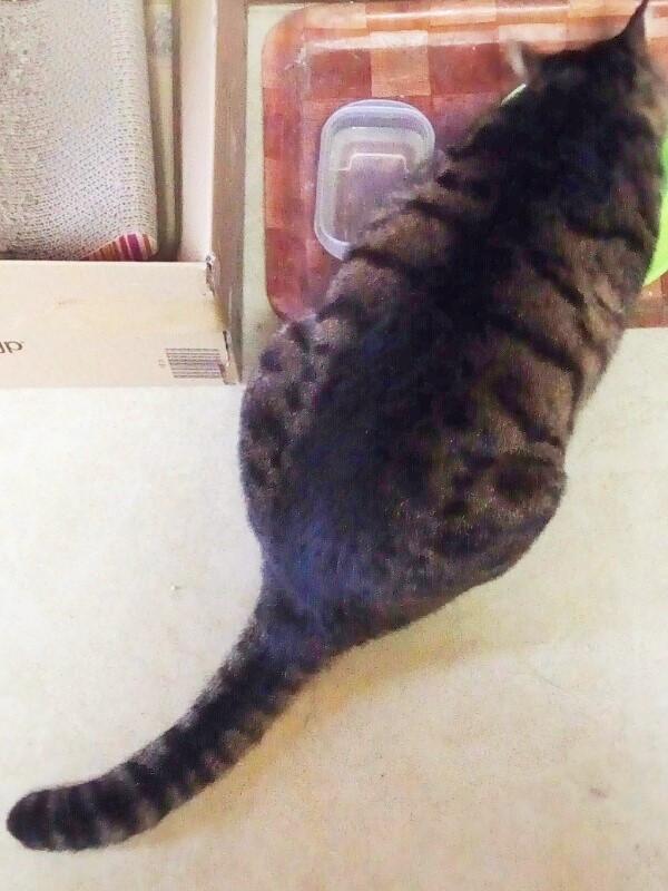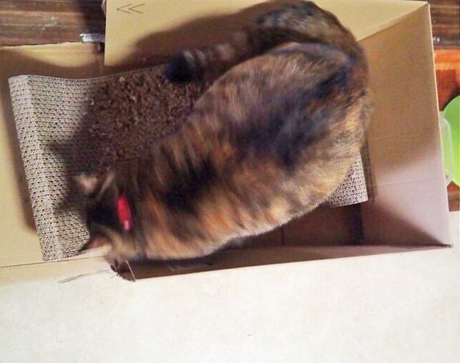 爪とぎの屑が散らばるのでダンボールで囲ってみました。