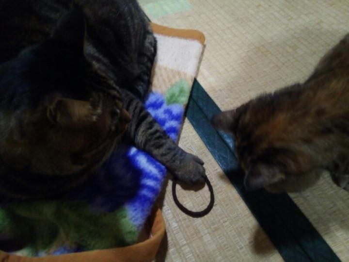 メロが遊べー遊べーと、うるさいので、ヘアゴムを与えたら