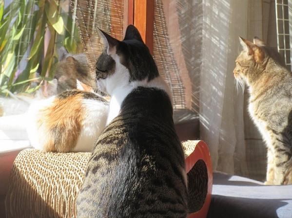 分りにくいですが、ひなちゃんの頭越しにエアコンの室外機の上にいるネロちゃんが見えています。