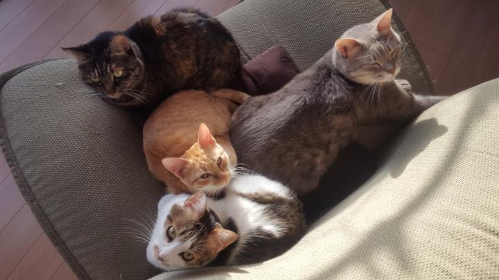 母は「よく4匹で一緒にいるょ」と言うけれど私にはレアな光景ょ…だって私が帰ると逃げ隠れる子がいるんだもの( T∀T)