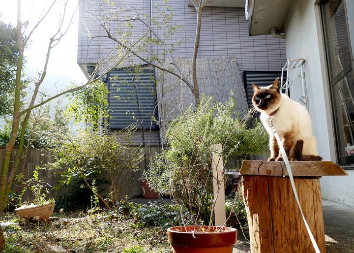 庭で散歩させると、すぐに外猫たちのやって来る塀の向こうへ行きたがります。