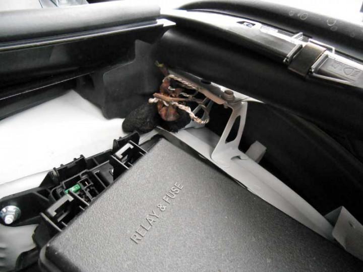 発見した場所は、エンジンルームの左(助手席側)の上の方・・ヒューズボックスのところです。