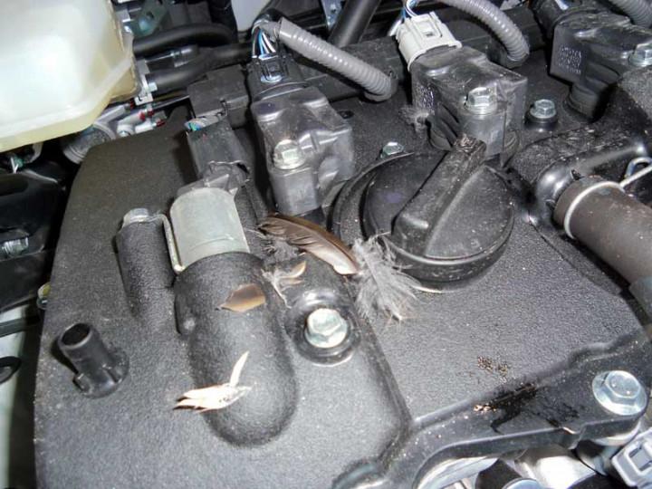 よくよくエンジンルームを調査すると、鳥くらいの大きさならエンジン中央部付近に進入できるルートが右のタイヤハウスから確保できそうなのが判明しました。