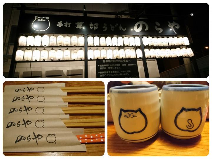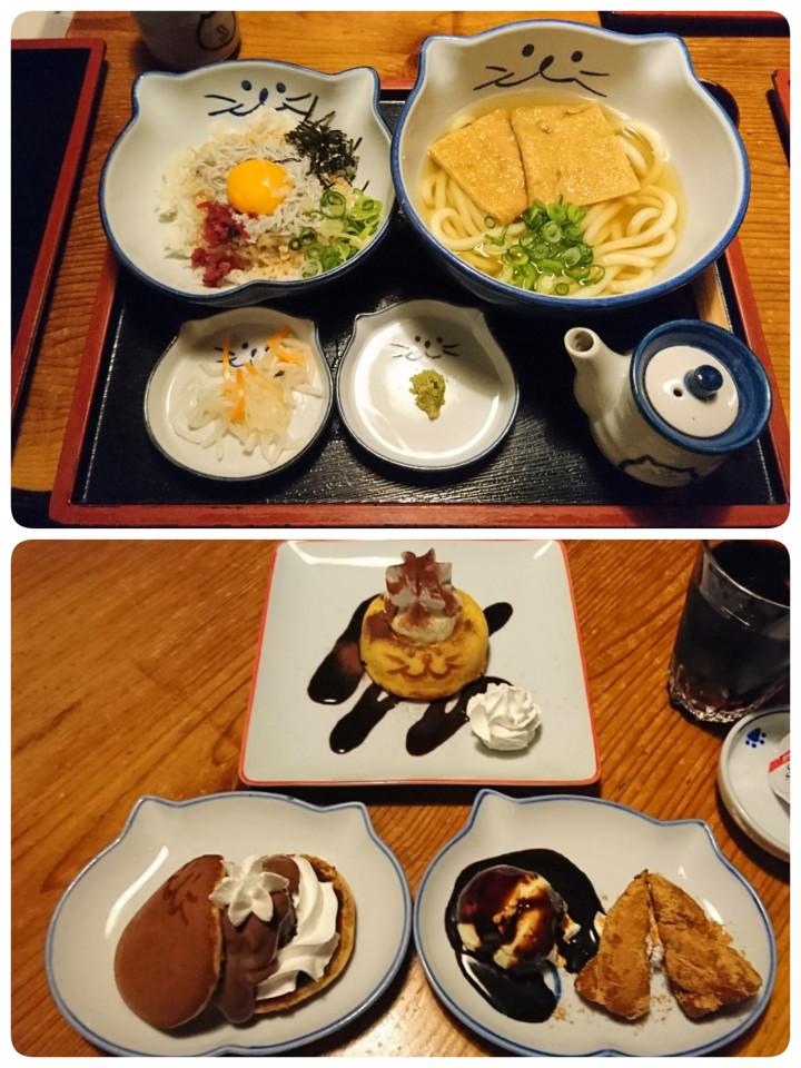 おうどんとデザートおいしく、食器はねこだらけでカワイイ~。