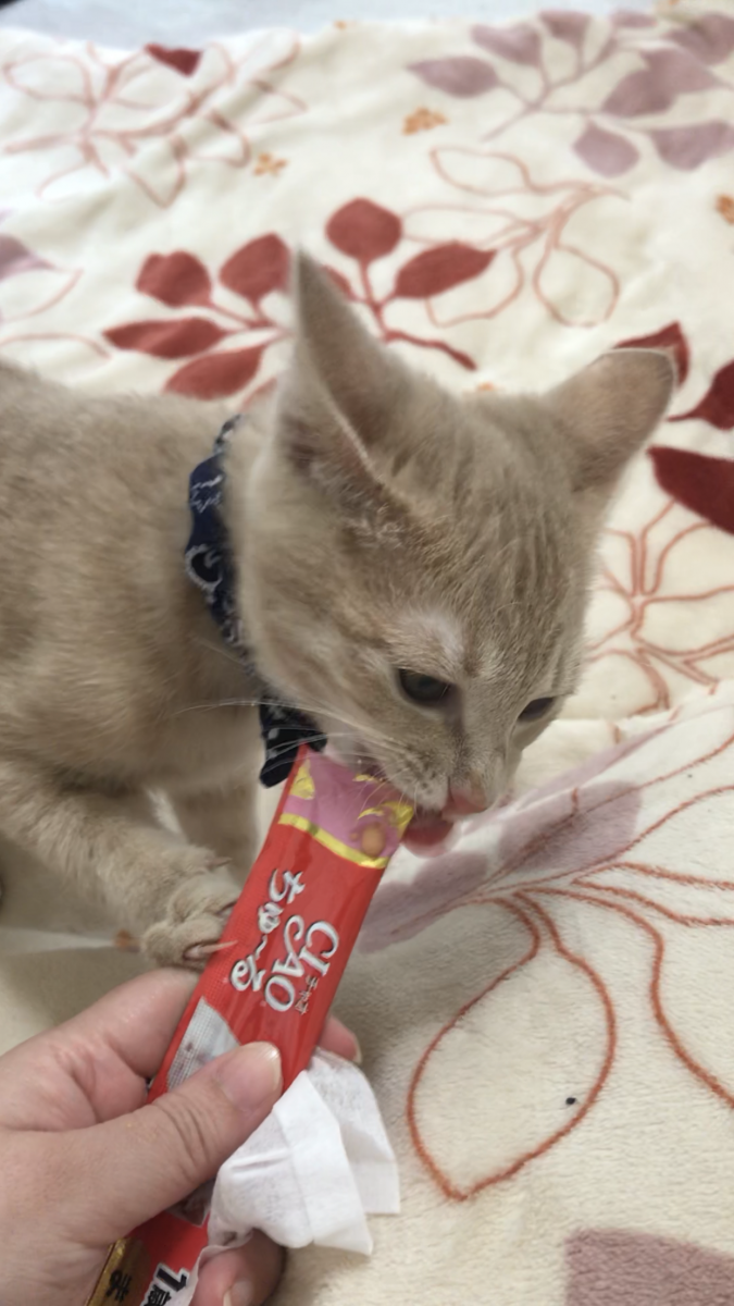 帰宅してすぐに、子猫用ちゅーるを初体験❣️