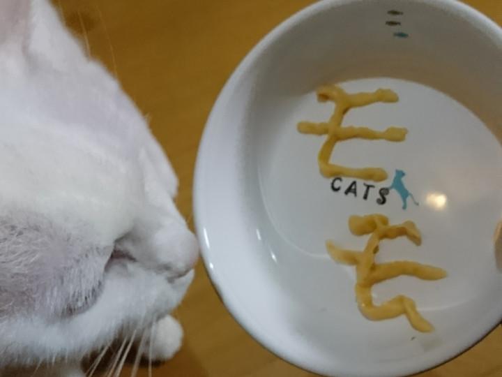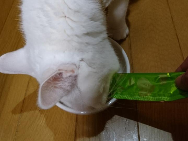 さて、モモちゃん。今日のオヤツは「ピューレKISS」つぶつぶパンプキン入りささみピューレ