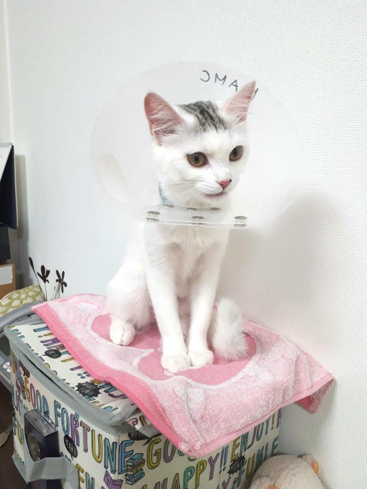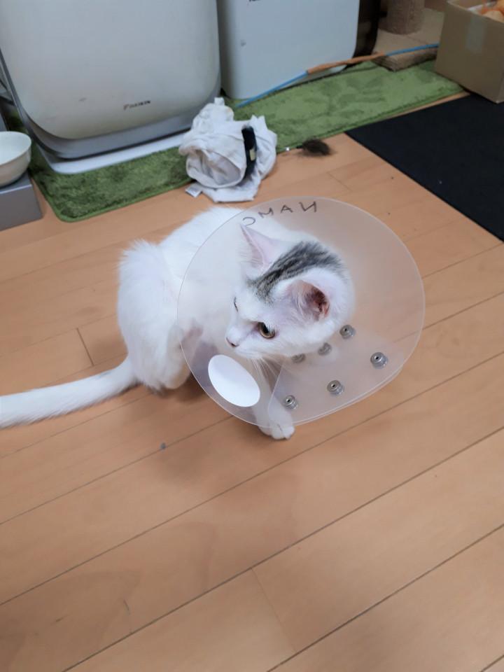 ご飯のときも邪魔でうまく食べれないから、お皿をカラーの中に突っ込んであげて食べさせる感じで。
