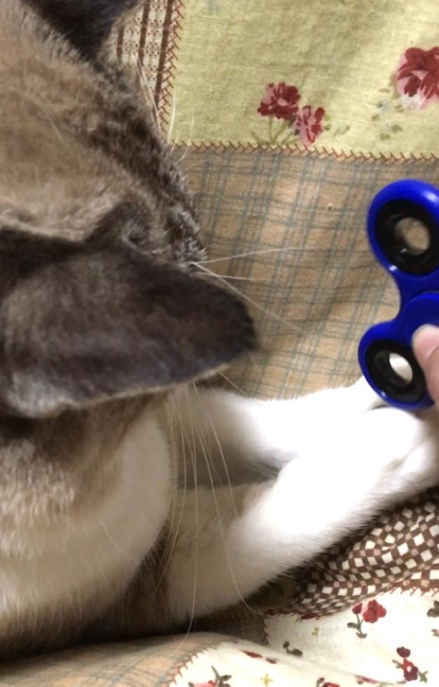 むうたがお膝に入ってくつろいでいるとき、そっと猫じゃらしをむうたの前で動かしてみました。