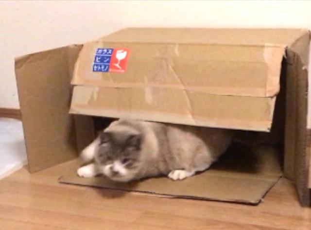 すると、何に反応したのかわかりませんが、ものすごい勢いでむうたがダンボールの中へダイブ!