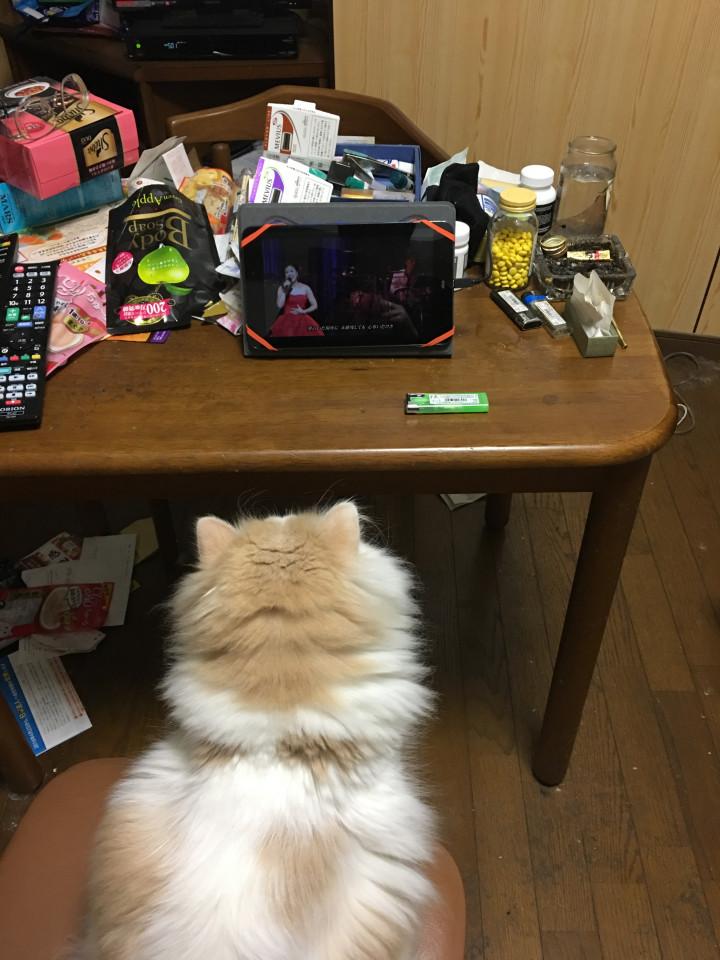 タブレットで再生した薬師丸ひろ子の画像を鑑賞中のスコえもん。食い入るような見方をしており、名曲は猫にも判るらしいようでした。