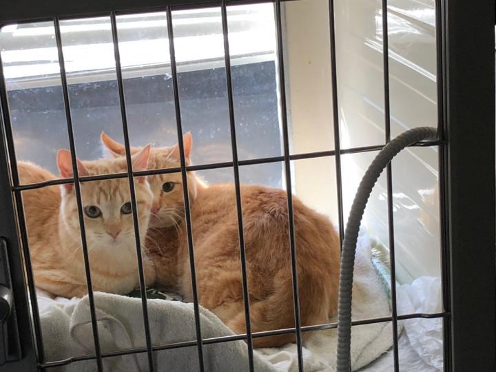 薄暗い部屋のケージの中に仲良しチャトラが一緒に入っている。おとなしい。