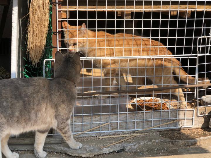 別のケージに、大きい方のチャトラが奥の壁に張り付いている。
