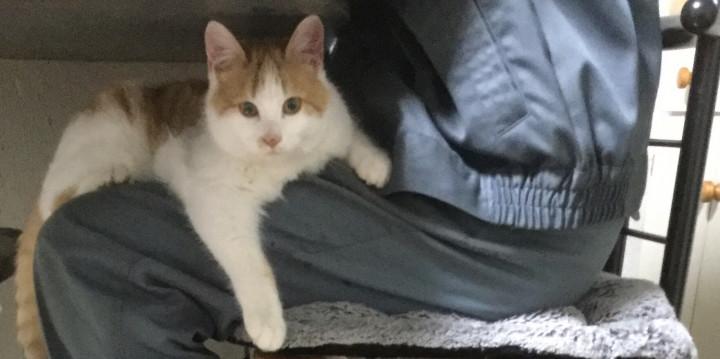 ( 食事中のおーちゃんのお膝に乗るちょむ。テーブルには上がらない