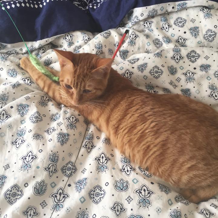 数週間ぶりにベッドの上で走って猫じゃらしを追いかける。