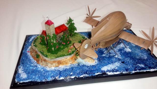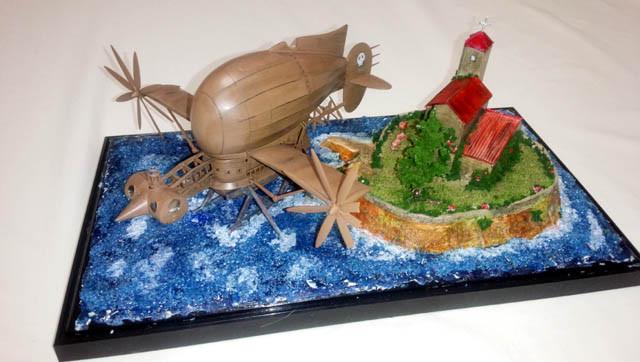 ところで、先般からご紹介していました「天空の城 ラピュタ」に登場する空賊?海賊ドーラ一家が乗ってるタイガーモス号を製作したのですが、単体だけじゃ面白くないってことで、ジオラマにしました。