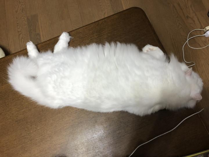 テーブルの上で寝てます。