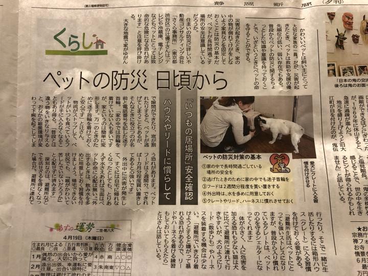 ところで、4月18日の静岡新聞の夕刊に、ペットの防災についての記事が掲載されていました。